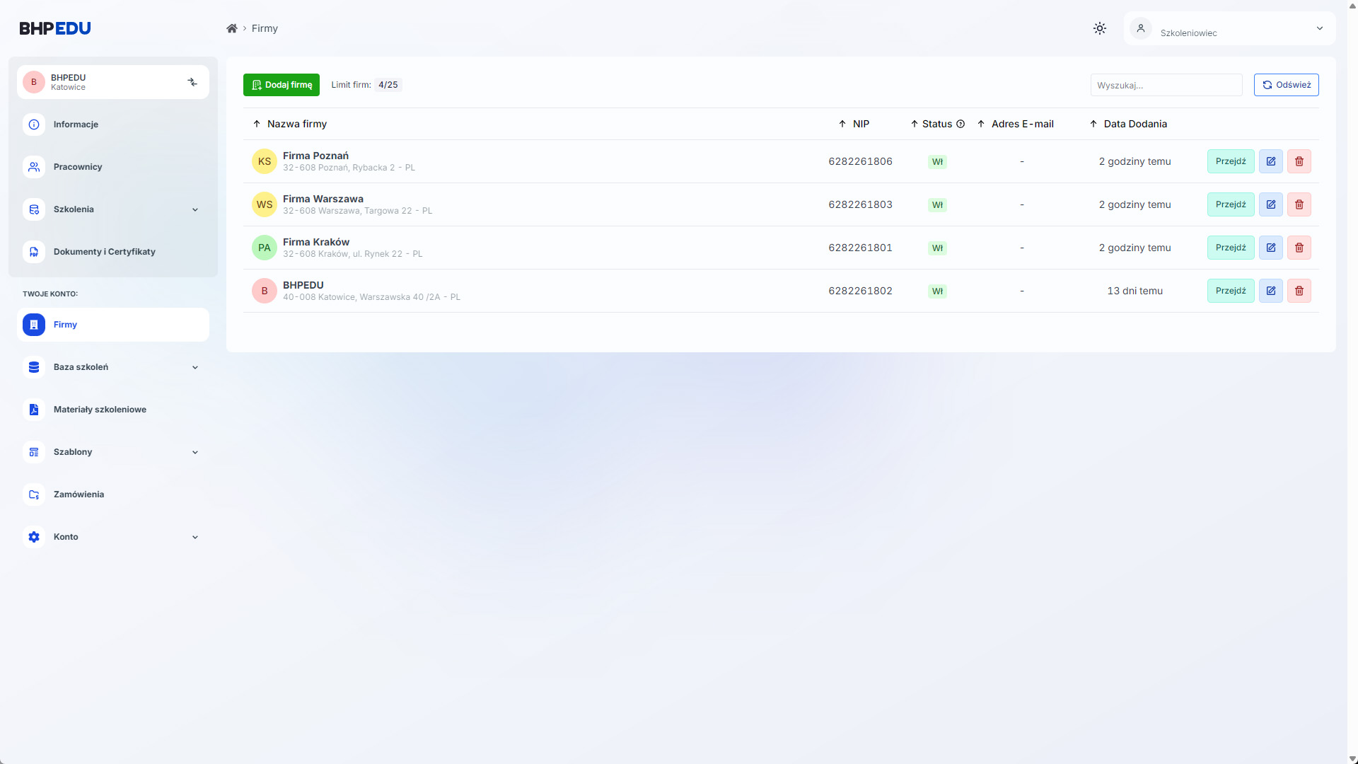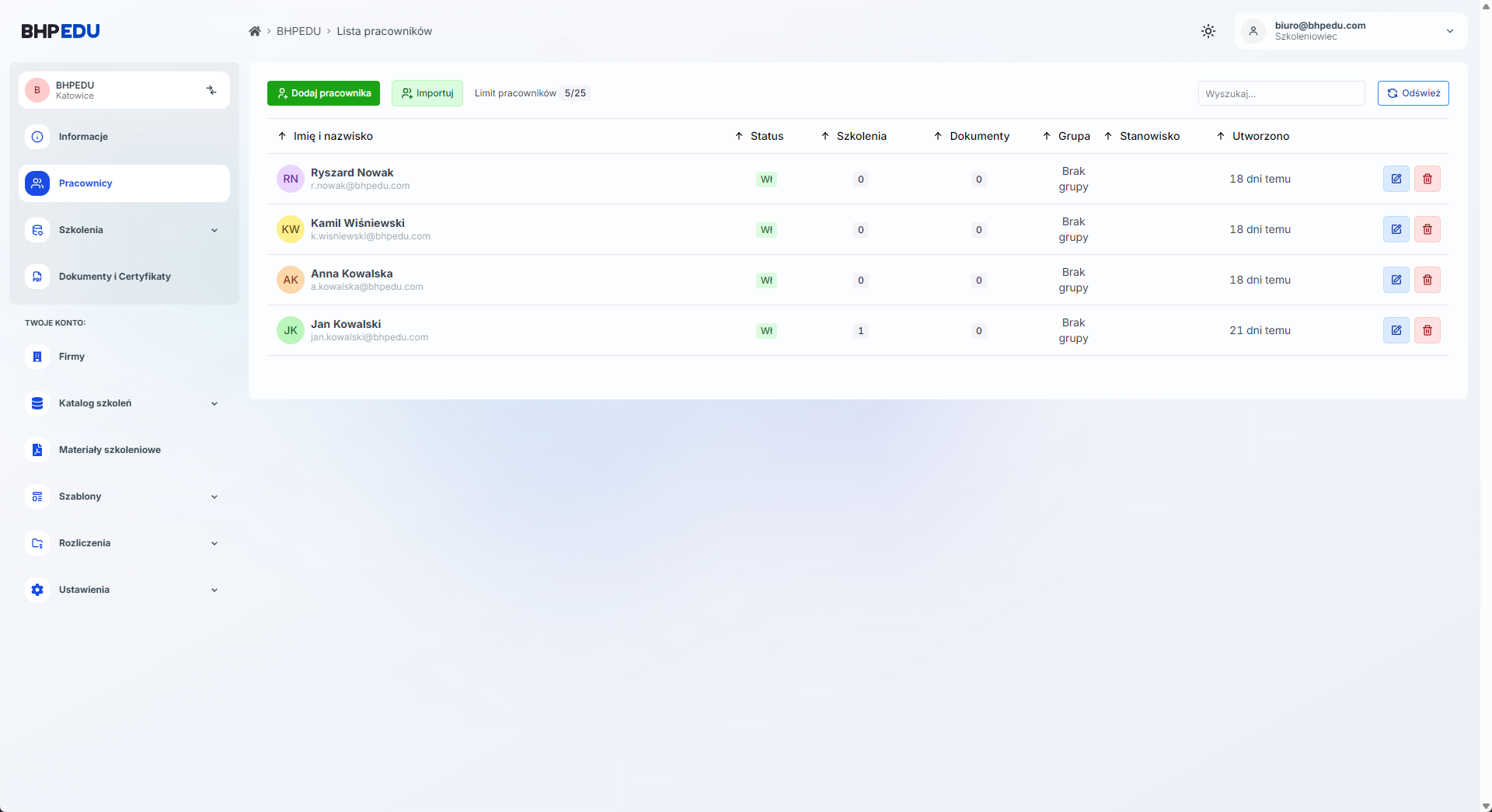 Dodawaj pracowników do firm, przypisuj do grup zawodowych (biurowi, kierownicy, robotnicy, służba BHP), zarządzaj danymi kontaktowymi i śledź historię szkoleń. System automatycznie przypomina o terminach odświeżenia szkoleń okresowych i wygasających certyfikatach.