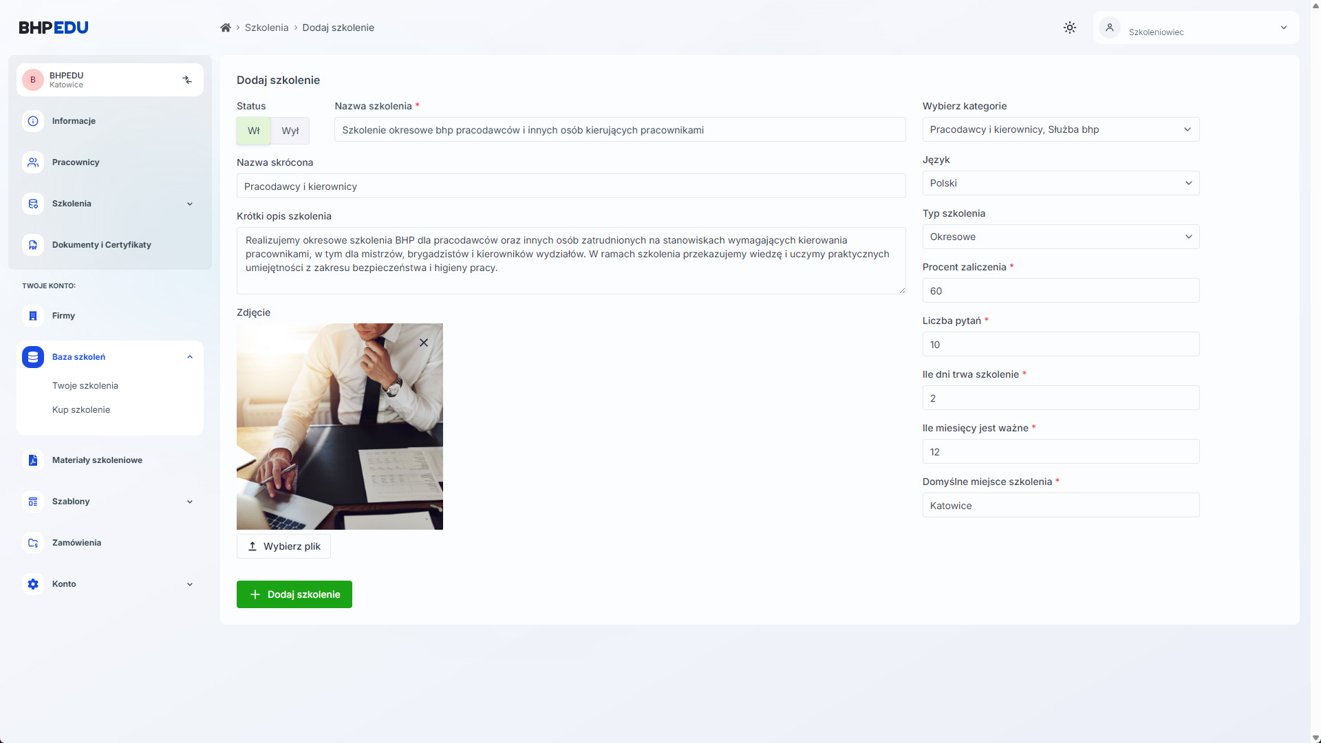 Nasza Platforma BHP to idealne narzędzie dla szkoleniowców BHP, którzy chcą usprawnić zarządzanie szkoleniami, klientami i dokumentacją. Niezależnie od tego, czy działasz samodzielnie, czy prowadzisz firmę szkoleniową, platforma oferuje funkcje dopasowane do Twoich potrzeb.