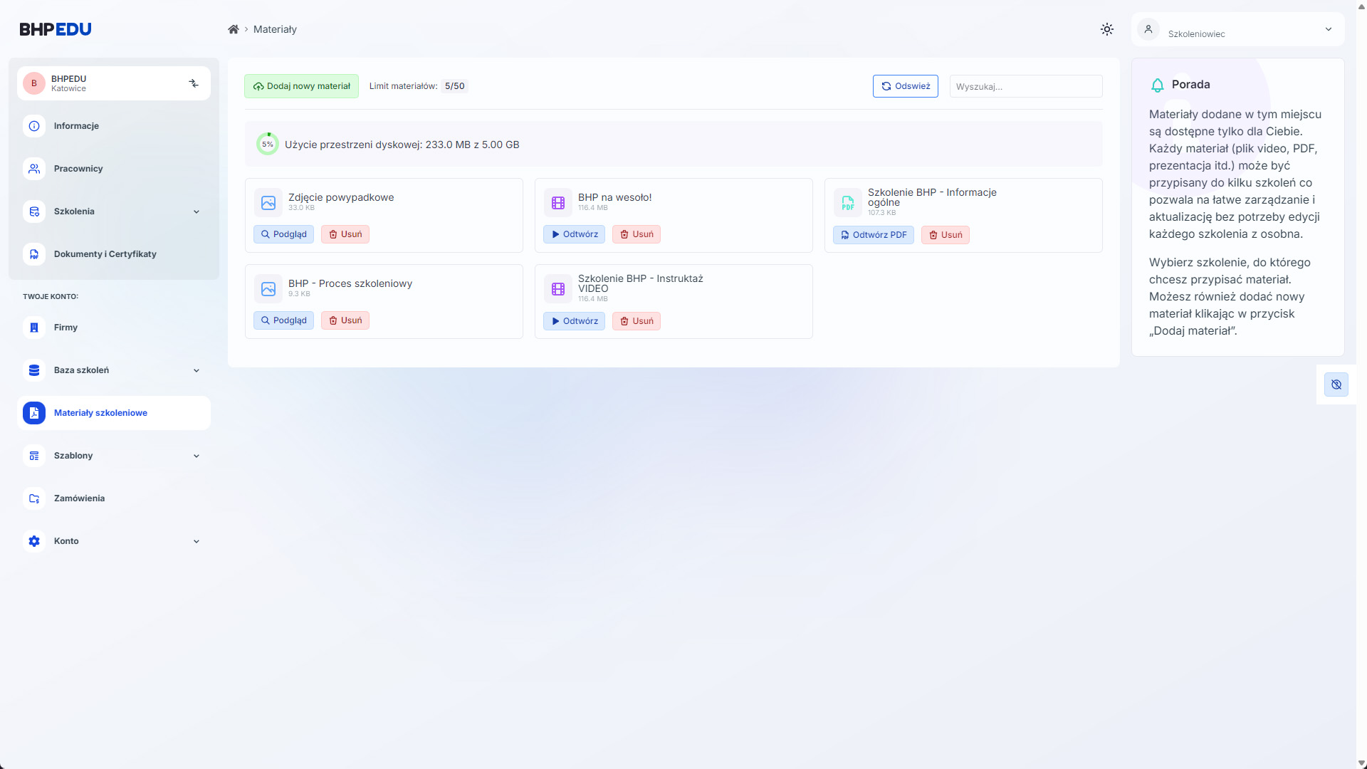 Przechowuj i zarządzaj swoimi materiałami szkoleniowymi w jednym, bezpiecznym miejscu. Nasza platforma umożliwia łatwe dodawanie, edytowanie i organizowanie materiałów, co pozwala na szybki dostęp do nich podczas tworzenia szkoleń dla Twoich klientów.