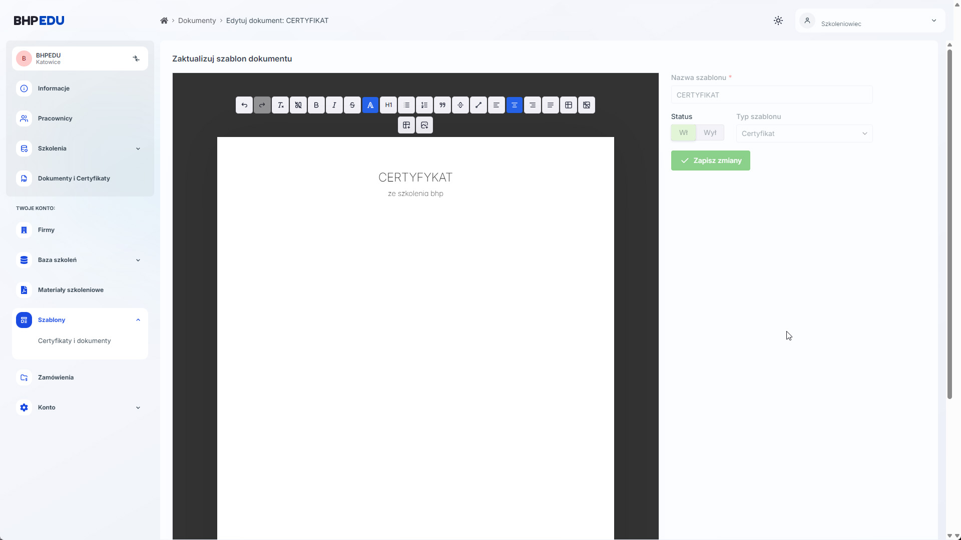 Twórz i zarządzaj szablonami certyfikatów oraz dokumentów szkoleniowych bezpośrednio na platformie. Personalizuj je zgodnie z wymaganiami swoich klientów, dodając logo, dane firmy i inne istotne informacje. Ułatw sobie proces generowania dokumentów po zakończeniu szkoleń.