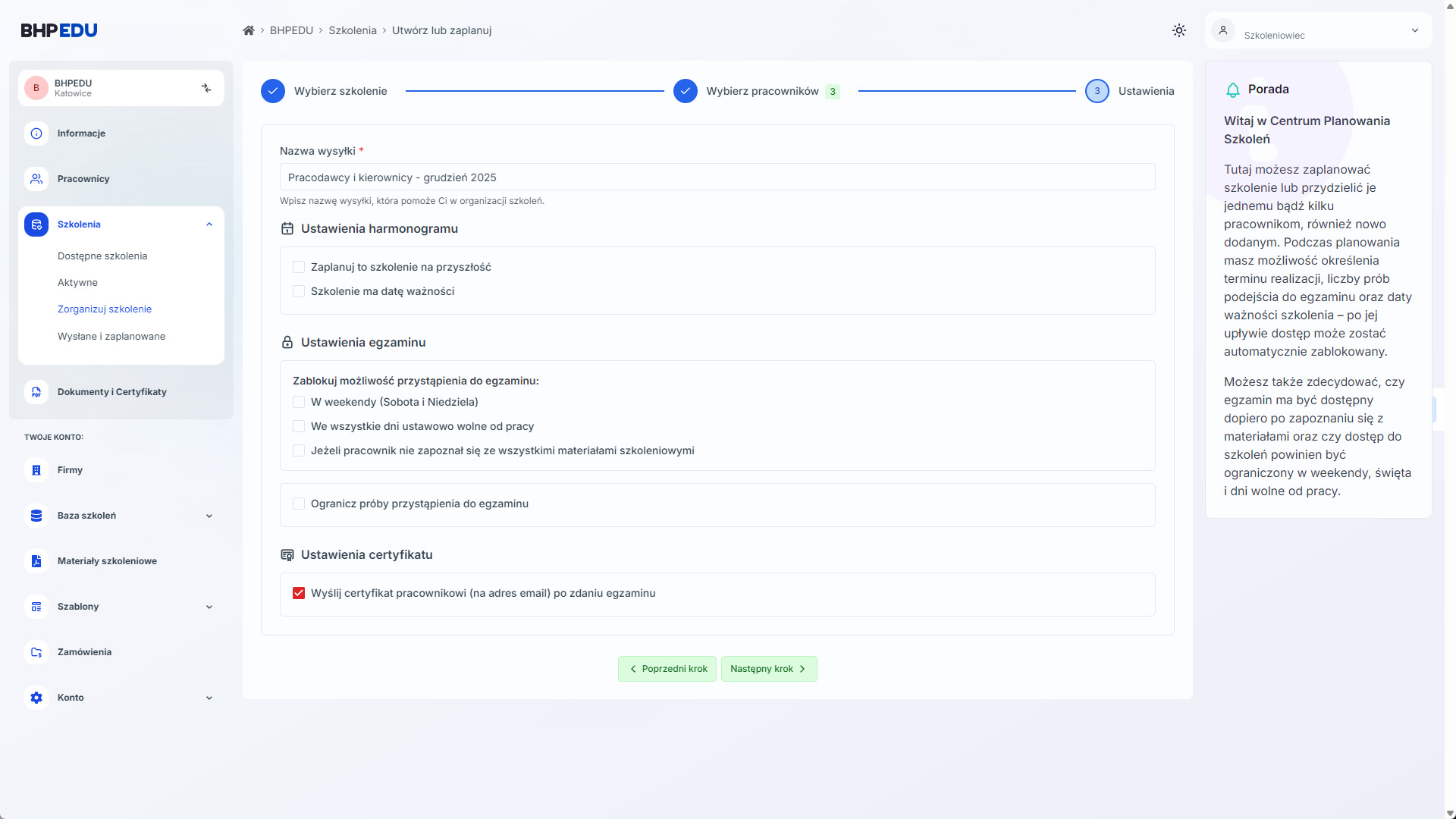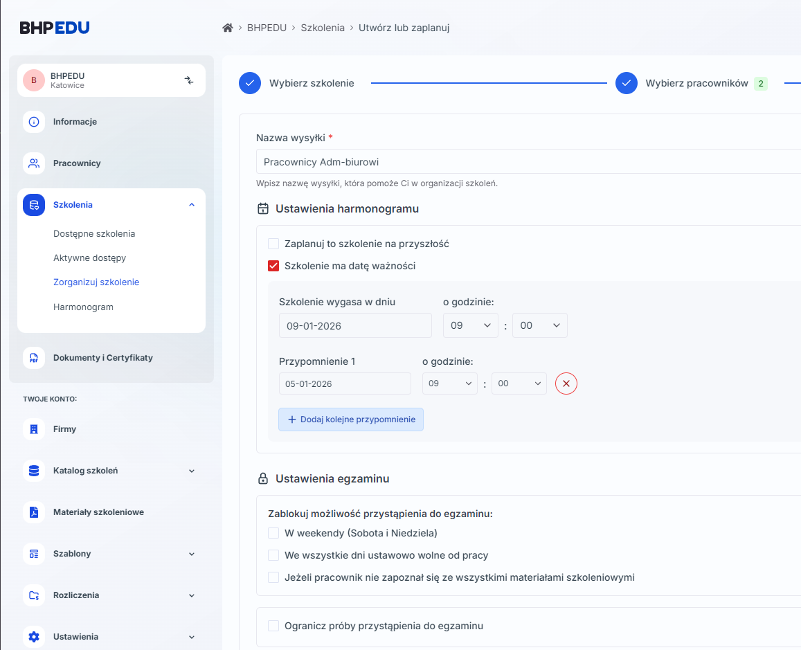 Decyduj, kiedy pracownicy Twoich klientów powinni odbyć szkolenie BHP. Platforma umożliwia planowanie terminów, automatyczne przypomnienia, ustawianie daty ważności oraz kontrolę dostępu do materiałów i egzaminu — także z uwzględnieniem godzin pracy i innych ograniczeń. Dzięki temu cały proces szkoleniowy przebiega w pełni pod Twoją kontrolą.