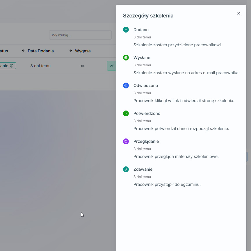 Śledź w czasie rzeczywistym, na jakim etapie znajduje się pracownik — od momentu przydzielenia szkolenia, przez otrzymanie e-maila i pierwszą wizytę w serwisie, aż po rozpoczęcie nauki i przystąpienie do egzaminu. Dzięki temu dokładnie wiesz, kiedy pracownik otwiera materiały, potwierdza dane i zaczyna zdawać egzamin.