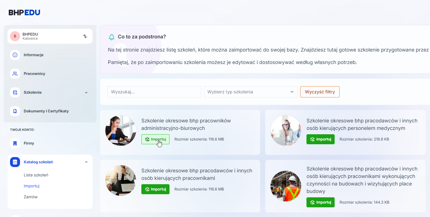 Oprócz tworzenia własnych szkoleń, możesz korzystać z gotowych kursów z naszego katalogu. Szkolenia wstępne, okresowe, PPOŻ, pierwsza pomoc - wszystko zgodne z obowiązującymi przepisami i gotowe do przydzielenia. Dostępne w 4 językach: polski, angielski, ukraiński, niemiecki.